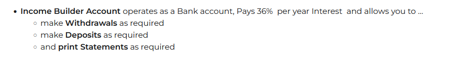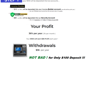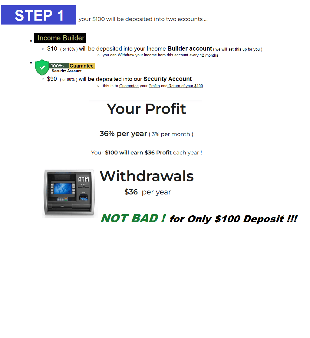 When presented with an Investment Opportunity that pays 36% per year Interest , I am sure you will understand that I am limited to working with only a few individuals that I have selected myself as our agreement is strictly based on TRUST and UNDERSTANDING. I am convinced that Seeing is Believing and what better way than to let you see for yourself the GREAT POWER of Income Builder by testing it for yourself with just $100 which will be refunded after 90 Days if you don't make 3% Profit each month ! EITHER WAY , WE WILL ADD $9 PROFIT TO YOUR $100 AND PAY YOU $109 IN 90 DAYS !