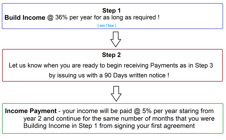 Our Income Builder account uses a very simple 3 Steps Process to allow you to Build the Income you require, with No Limits as to how much you invest ( min $100 ) or how much Income you want to Build to live the Life of your dreams !