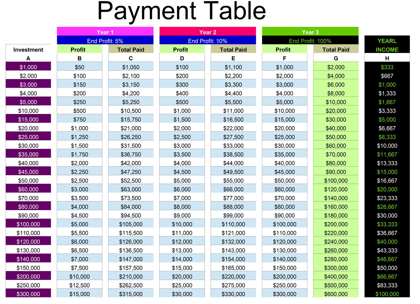 at end of year 3 you will earn 100% Profit as in ( column F )