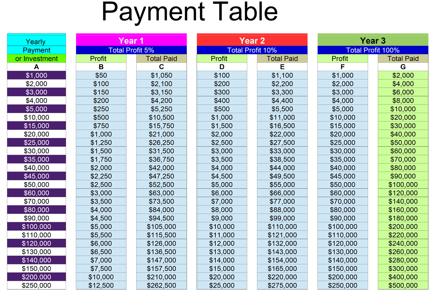 find $70,000 in ( column A ) of the Payment Table above
